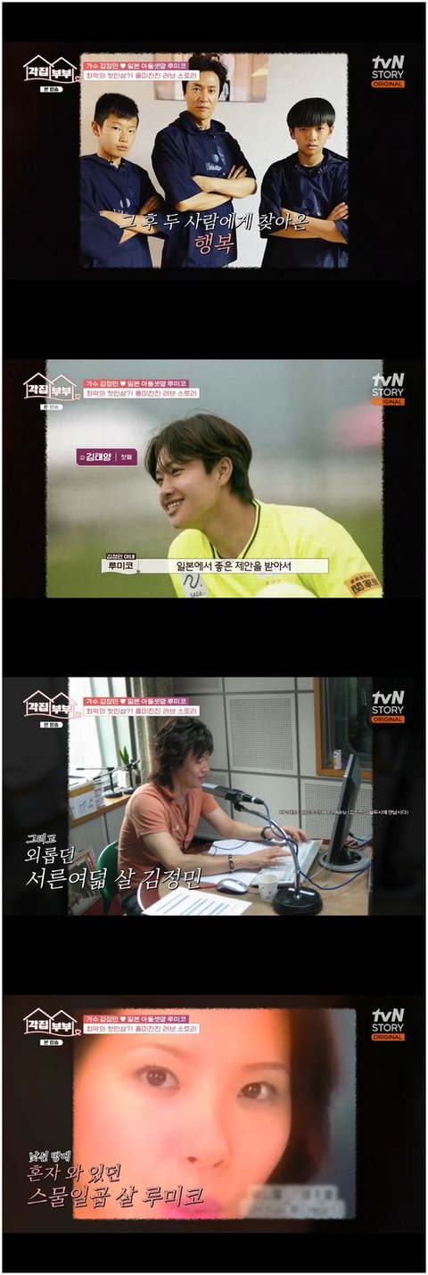 4일 첫 방송한 tvN STORY ‘각집부부’에서는 문소리에 이어 김정민, 루미코 부부가 등장했다. 김정민은 루미코와 함께 살아가며 결혼 생활을 할 줄 몰랐던 첫 만남을 회상했다.