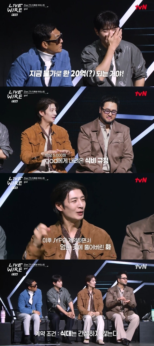 Mnet ‘라이브 와이어’ 캡처이날 god를 설명하는 키워드로는 '식비 2억 8천 (3개월 기준)'이 나왔다. 정재형이 이를 두고 "그 많은 돈을 JYP가 감당해준 거냐"고 묻자 자이언티고 본인의 궁금증을 하나 보탰다. "그 당시 물가냐"는 것. 정재형은 이것도 중요한 문제라며 "지금 한 20억 되는 거다. 그때 비싸봐야 백반이 6, 7천 원이었다"고 말했다.