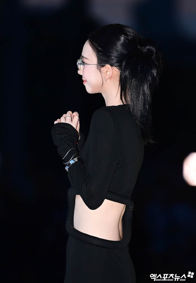 이날 카리나는 블랙 롱드레스를 입고 등장해 시선을 사로잡았다. 잘록하면서도 탄탄한 허리 라인이 드러나는 컷아웃 디테일이 포인트인 드레스로 고급스러운 분위기를 연출했으며 블랙 스틸레토 힐을 매치해 시크한 실루엣을 완성했다.