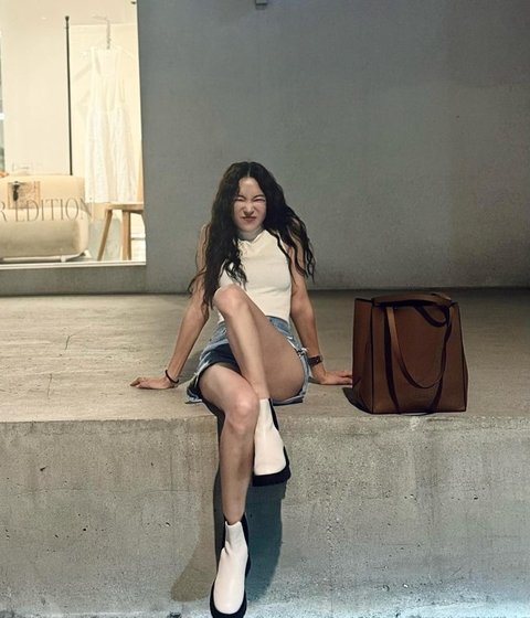 사진 속 김윤지는 민소매에 숏팬츠를 매치해 시원해 보이는 여름 룩을 보여준다. 김윤지는 길거리에 앉아 눈웃음을 지으며 환하게 웃고 있다.