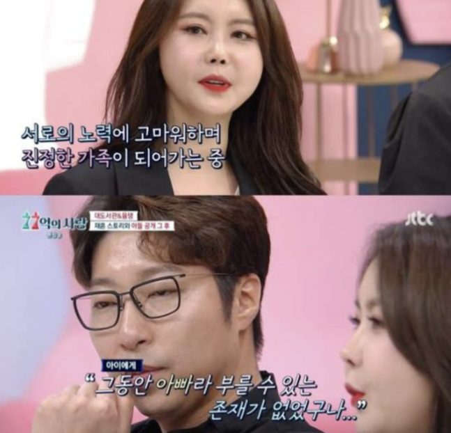 윰댕과의 재혼으로 생긴 아들과의 생활에 대해서는 “나는 눈치를 덜 보는 것 같다. 아무리 재혼이고 새 아빠라고 하더라고 남의 눈치 보기 싫어서 무작정 잘해주거나 하지 않는다. 지금은 좋은지 몰라고 나중에 어떻게 될지 모른다. 오히려 좀 더 엄한 기준으로. 그래서 아내에게 미안하긴 하다. 내가 아이를 엄하게 대했을 때 신경 쓰는 모습이”라고 솔직하게 말했다.