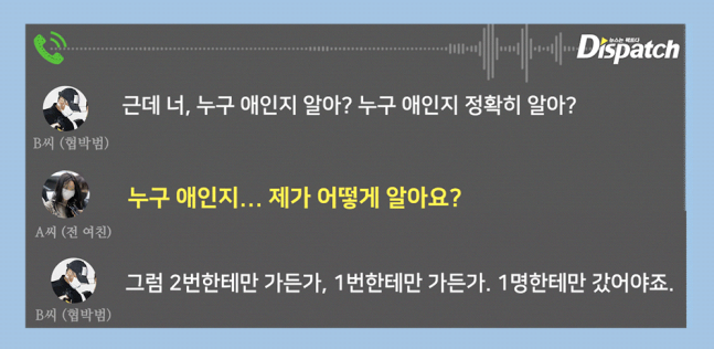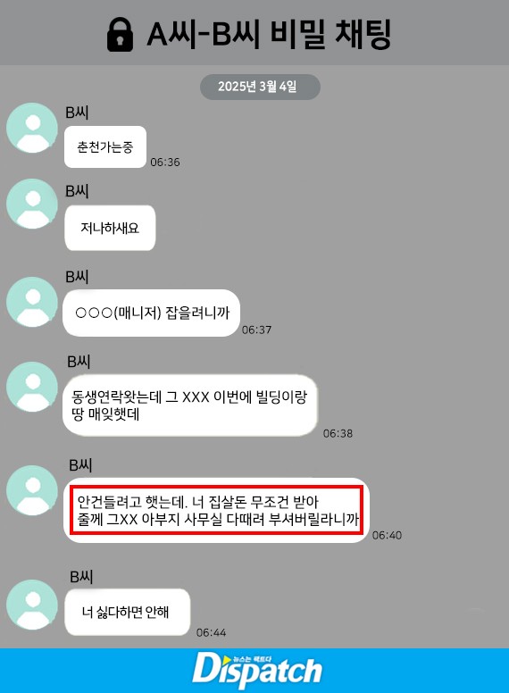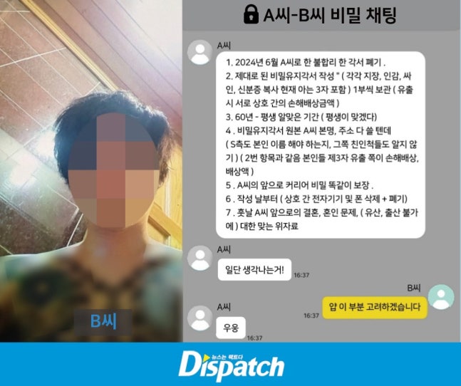 하지만 여전히 의문은 남는다. '디스패치'는 B씨와 A씨가 나눈 비밀대화를 확보했다. A씨가 비밀유지서약 내용을 고쳐 달라고 요청하는 내용, B씨가 수십억을 받아서 아파트를 사주겠다는 내용이 있었다.