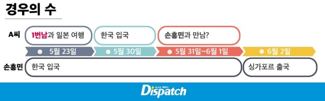 손흥민은 2024년 5월 23일, 북중미월드컵 아시아 지역 2차 예선을 위해 입국했다. 당시(23일), A씨는 한국에 없었다. 1번남과 함께 일본 여행 중인 것으로 파악된다.