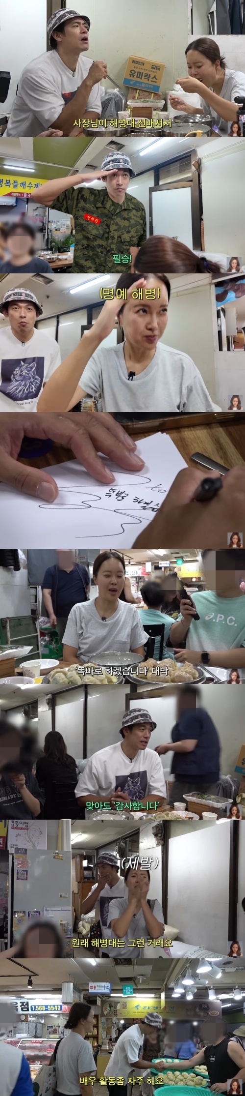 이후 추가한 만두가 나왔고, 정석원은 사인을 하면서 '똑바로 하겠습니다'라고 적었다. 해병대 선임이자 만두가게 사장님은 "우리는 '죄송합니다'가 없다"라고 했고, 정석원은 "맞아도 '감사합니다'라고 한다. 선임이 때리면 '감사합니다' '똑바로 하겠습니다'라고 한다"고 밝혀 웃음을 안겼다.