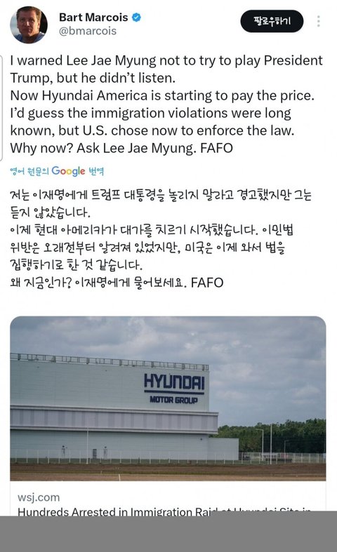 현대가 22년, LG가 23년에 들어간 사업이고 당시 윤석열 정부가 본인들 치적으로 삼았던 사업임 이때 비자등 인력 문제들도 당연히 협의를 했어야지 이걸 해결 안하고 뭉게다가 이사단이난건데 이걸 지금 정부한테 비판을 한다고???ㅋㅋㅋㅋㅋ 처음에 협의를 잘했으면 트럼프가 바이든 업적 날리고싶어서 ㅈㄹ해도 방법이없었겠지 ㅋㅋㅋㅋㅋ 거기다 미국 국우에서 신고한거라며~(본인이 신고했다고 기사뜸) 미국도 신고들어왔으니 당연히 단속을 한거고 오히려 그동안 불법을 저지고있었던게 문제인거아님?? ㅋㅋㅋㅋㅋ 비자를 안내줬다고??ㅋㅋㅋ 그러니까 그걸 정부든 기업에서 외교든 로비든 풀었어야지 ㅋㅋㅋ몇백억을 투자하면서 거기에 투입되는 노동자 비자도 못받아낸 정부는 뭐했던거냐??ㅋㅋㅋㅋㅋㅋ 당연히 지금 정부가 나서서 해결해야겠지만 비난하려면 처음에 협상하신 윤석열정부과 기업을 욕하셔야지 ㅋㅋㅋㅋ