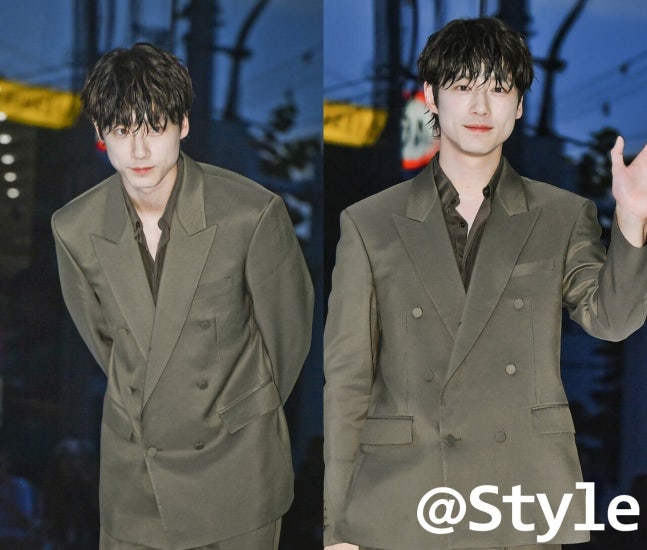 사카구치 켄타로는 카키 컬러의 더블 슈트에 다크 브라운 셔츠를 매치해 댄디한 룩을 택했다. 긴 머리를 자연스럽게 연출한 웨트 헤어와 부드러운 미소가 더해지니 정장 차림도 전혀 무겁지 않다. 은은한 광택이 도는 슈트의 디테일 덕분에 격식을 갖춘 듯한 분위기도 더해졌다. 어딘가 '어른 남자미'가 은은하게 느껴지는, 성숙함까지 모두 잡은 패션이다.