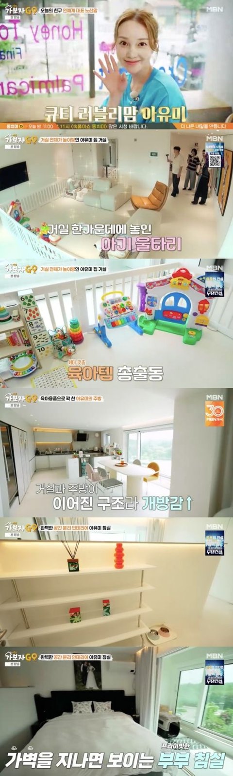 아유미 집 주방은 숲뷰를 자랑했고 거실과 주방이 이어진 구조로 개방감이 돋보였다. 집에서 즐기는 고퀄리티 시티뷰도 한몫했다. 주방은 육아와 관련한 물품으로 가득 찼고, 안방은 가벽을 세워 독특한 분위기를 풍겼다. 그린 컬러로 포인트를 준 침대와 침대 위에 결혼사진을 두며 부부애를 뽐냈다.