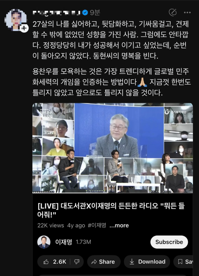 또한 용호수는 “나를 건드리면 피눈물을 흘리며 고통 속에 살거나 죽는다”, “휘성처럼 가버렸다” 등 또 다른 고인인 휘성까지 언급하며 비상식적인 발언을 이어갔고 대도서관이 이재명 대통령의 경기도지사 시절 함께한 라이브 방송을 캡처하며 “용호수를 모욕한 트렌디한 민주화운동의 개”라고 직접적인 비하를 이어갔다.