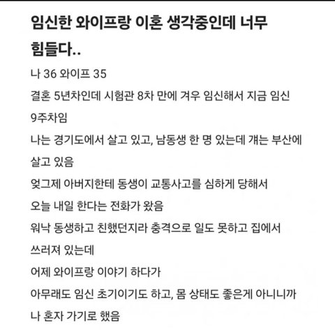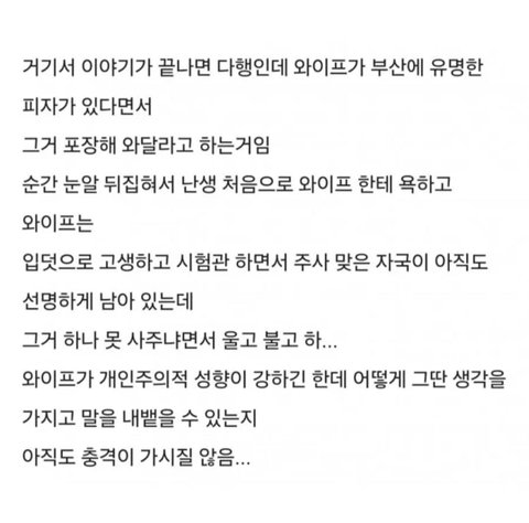아내 ㄹㅇ 심각하게 공감능력 결여된 것 같은데; 아무리 자기 상황이 힘든 상황이라고 해도 남편 상황도 정신적으로 스트레스 씨게 받을 안좋은 상황인데 그런 상황에서 태연하게 음식 사오라고 시키는 게 말이 되나… 일개 20대 초반 대학생인 나도 안 저럴듯…