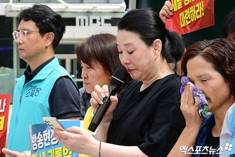 (엑스포츠뉴스 박지영 기자) 8일 오전 서울 상암동 MBC 문화방송 사옥 앞에서 故 오요안나 MBC 전 기상캐스터 추모 주간 투쟁 선포 기자회견이 진행됐다.