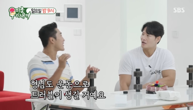 SBS ‘미운 우리 새끼’ 캡처.김동현은 “형수님과 운동으로 트러블이 생길 것”이라 예언했고, 김종국은 “유일하게 그걸로 싸운다”고 솔직하게 인정했다. 이어 김희철이 “(형수님에 대한) 소문이 많다. 본 사람이 아무도 없다. LA 출신 화장품 사업가라는 말도 있다”고 묻자, 김종국은 “내가 정확히 말하겠다. 다른 건 말하지 않는데 LA 얘기는 늘 나오더라”며 예비 신부의 정체에 대한 발언을 예고했다.