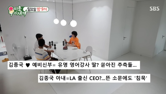 SBS ‘미운 우리 새끼’ 캡처.앞서 온라인 커뮤니티에는 김종국의 아내를 두고 ‘LA 출신 화장품 회사 CEO’, ‘20세 연하 유명 영어 강사의 딸’ 등 추측이 무성했다. 다만 예비 신부에 대한 정보는 전혀 알려지지 않았고 결혼식 역시 사회는 김종국과 절친한 유재석이 맡은 것 외에는 알려진 바가 없을 정도로 철통 보안 속에 진행됐다.