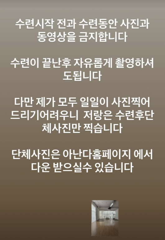 이어 “제가 일일이 사진을 찍어드릴 수는 없어, 수업 후 단체 사진만 촬영한다. 단체 사진은 아난다 홈페이지에서 다운받을 수 있다”고 전했다.