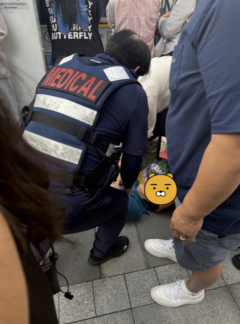 근데 갑자기 앞에서 5~60대로 보이는 일본 여성분이 심정지가 왔는지 바닥에 머리부터 떨어지면서 쓰러지셔서 주변분들이 여기 사람 쓰러졌다고 계속해서 부르는데도 아무도 안오고 주변분들 막 패닉와서 어쩔줄 몰랐는데, 어떤 검은 셔츠입은 30대 한국 남자분이 오셔서 119부터 부르시고 다리 주무르시면서 일본어로 막 뭐라 하시는데 그냥 정신깨게 하려고 그러신 것 같았어요.