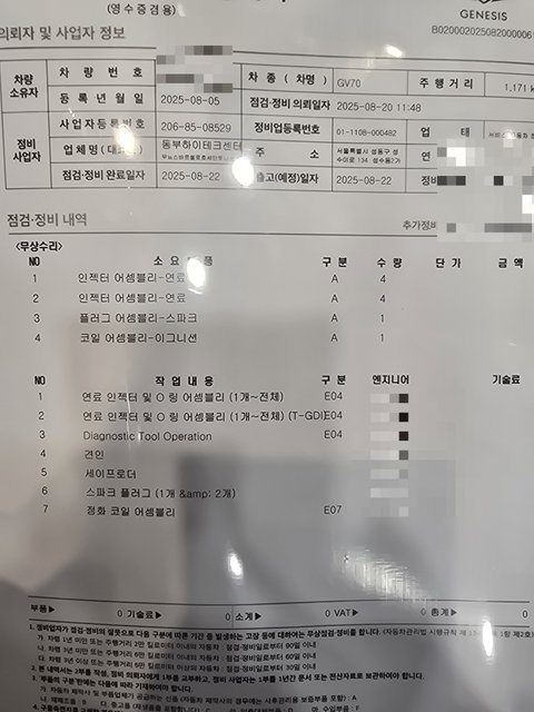 - 2025년 8월 20일 (주행거리 1,171km) : 동일 증상 재발 → 동부하이테크 입고 → 3번 실린더 원복 및 엔진 계통 교환