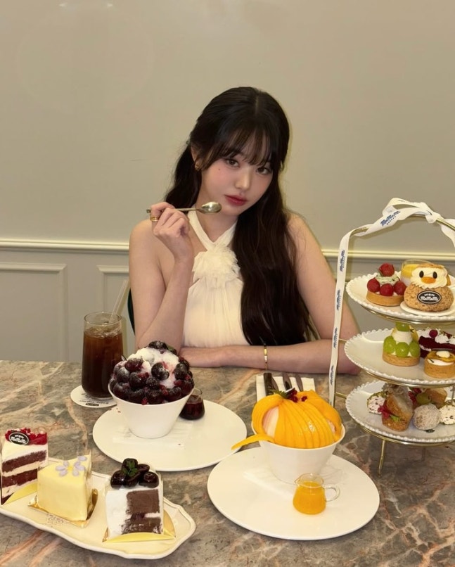 테이블 가득한 디저트와 함께 찍은 컷에서는 사랑스럽고 발랄한 모습이, 샹들리에 앞에서 포즈를 취한 사진에서는 고혹적이고 성숙한 분위기가 담겨 눈길을 끌었다.