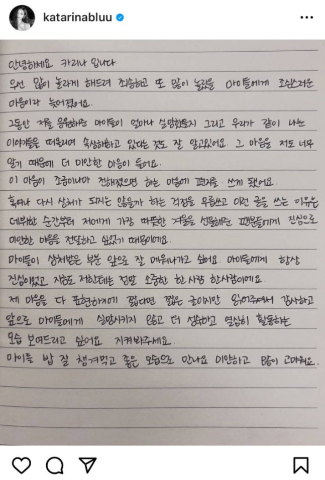 출처 : 카리나 인스타그램◆ 안진용> 전형적인 그런 느낌인데 그런데 사과문을 보신 사람들은 좀 이상하다고 느꼈을 거예요. 걱정하고 미안하고 정말로 마이. 이 마이는 팬덤의 이름입니다. '마이들에게 항상 진심이었고 지금도 너무 소중한 사람이다'라고 하는데 내가 뭘 잘못했다는 내용은 없어요. 통상적인 반성문이나 사과문은 내가 이런 일을 한 것에 대해서 여러분들께 사과합니다라고 하거든요.