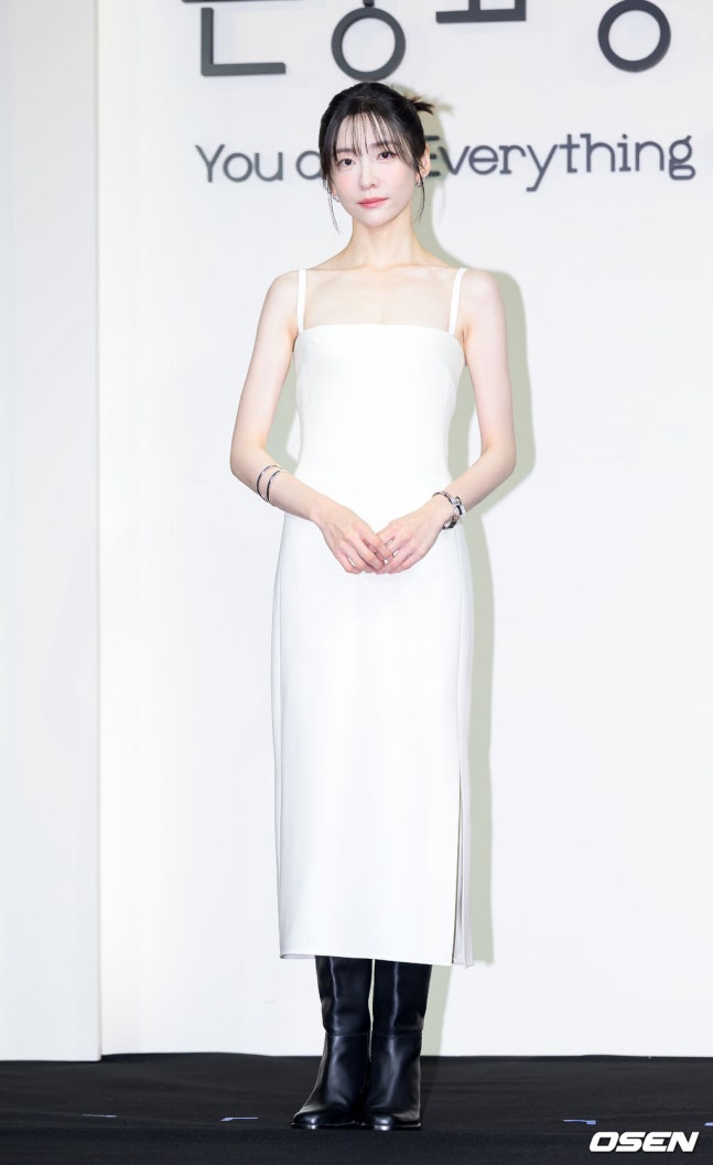 박지현은 절제된 미니멀리즘이 돋보이는 화이트 슬립 드레스를 선택했다. 심플한 드레스에 블랙 롱부츠를 매치해 모던한 대비를 살렸고 실버톤 액세서리로 세련된 우아함을 더했다.