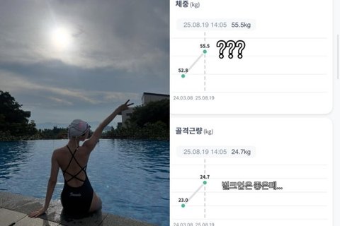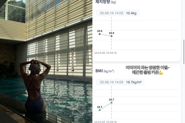 하지만 체지방량은 10.6kg에서 10.4kg으로 소폭 감소했고, BMI지수는 18.7에서 19.7로 늘어나 "여리여리와는 영원한 입려~ 매끈한 물범 커몬"이라고 덧붙였다.