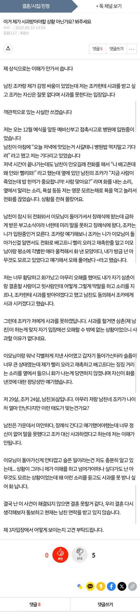 이거 다시 올린 인간도 여자가 잘못했다 생각하나봐? 난 조카 잘못 맞다고 생각한다 조카가 사과해야지 맞지