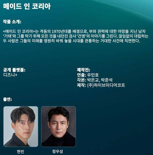 [OSEN=연휘선 기자] 배우 현빈, 정우성 주연의 디즈니+ 신규 오리지널 시리즈 '메이드 인 코리아'가 공개 전부터 시즌2까지 확정돼 기대를 모으고 있다.