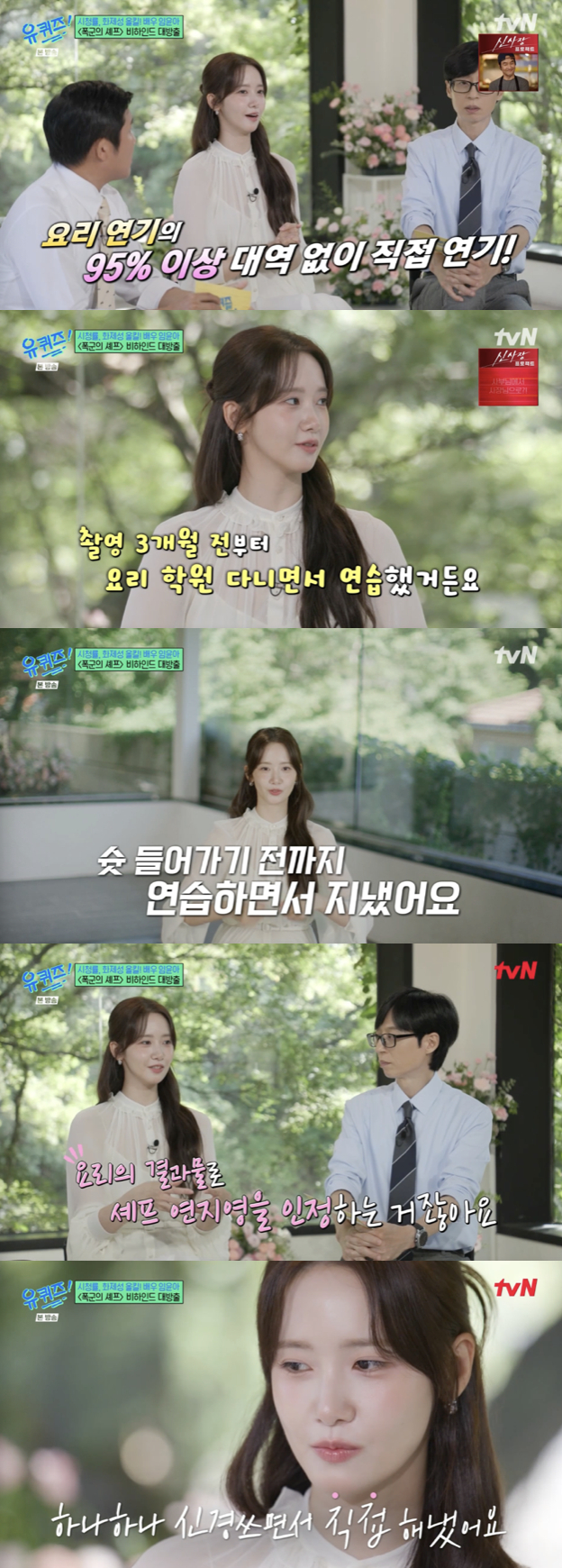 그는 요리하는 장면을 연기하기 위해 촬영 전 학원을 다니며 요리를 배웠다고 밝혔다./사진=tvN 예능 '유 퀴즈 온 더 블럭'그는 "촬영 3개월 전부터 요리 학원 다니면서 연습했다. 자문 선생님과 셰프님들에게 가서 따로 요리를 배웠다. 요리가 매개체가 돼서 이루어지는 작품이다 보니 요리가 진짜 중요했다"라고 말했다.그러면서 "현장에서 칼질과 요리 연기의 95%를 직접 했다"라며 "요리 동작 연습을 현장에서도 엄청 했다. 퀸넬(숟가락으로 모양을 잡아 둥근 형태의 음식)을 위해 쉬는 시간이 되면 슛 들어가기 전까지 계속 연습하면서 지냈다"라고 설명했다.