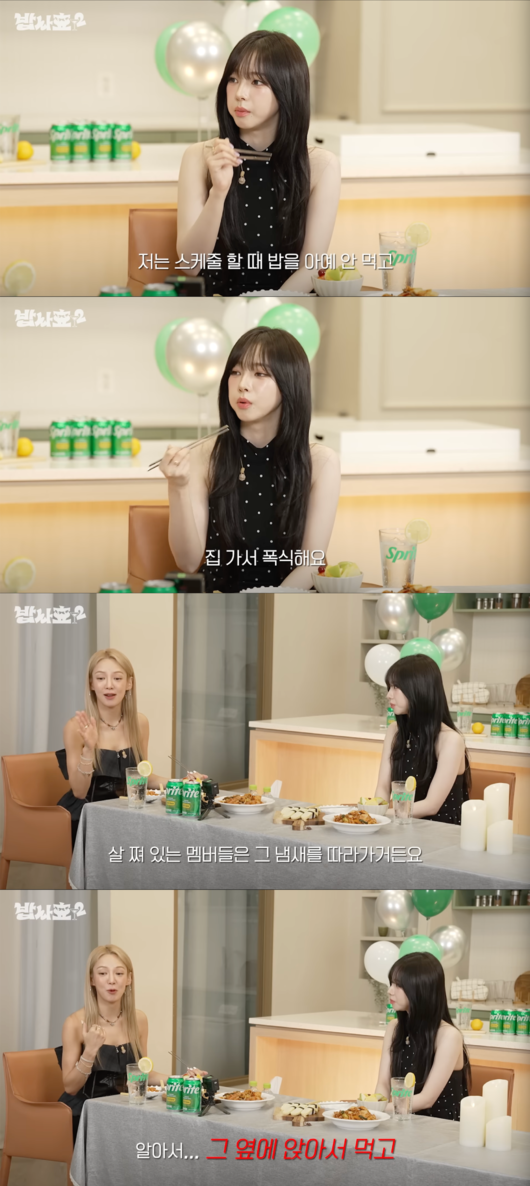 이날 카리나에 음식과 탄산음료를 대접한 효연은 “야식도 자주 먹냐”고 물었고, 카리나는 “스케줄 때 밥을 아예 안먹고 집 가서 폭식한다”고 밝혔다.