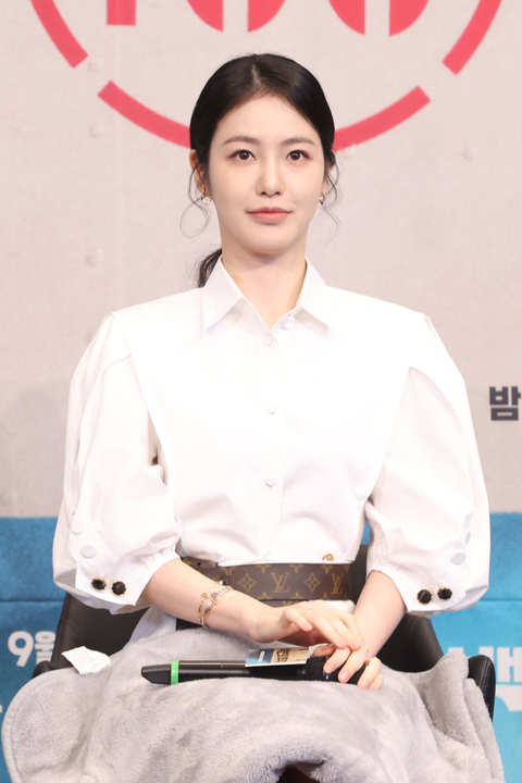 배우 신예은이 11일 서울 구로구 더링크서울에서 열린 JTBC 드라마 ‘백번의 추억’ 제작발표회에서 질문을 듣고 있다. 사진 연합뉴스