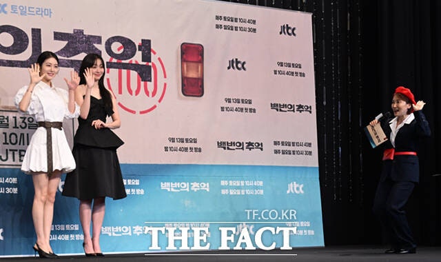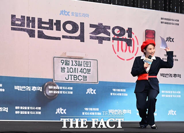 박경림이 극 중 주인공의 직업인 버스 안내양 차림으로 포토타임을 진행하며 출연자들의 포즈를 유도하고 있다.방송인 박경림이 11일 서울 구로구 더 링크 서울 호텔에서 열린 JTBC 새 토일드라마 '백번의 추억' 제작발표회에서 극 중 주인공의 직업인 버스 안내양 차림으로 진행을 하고 있다.