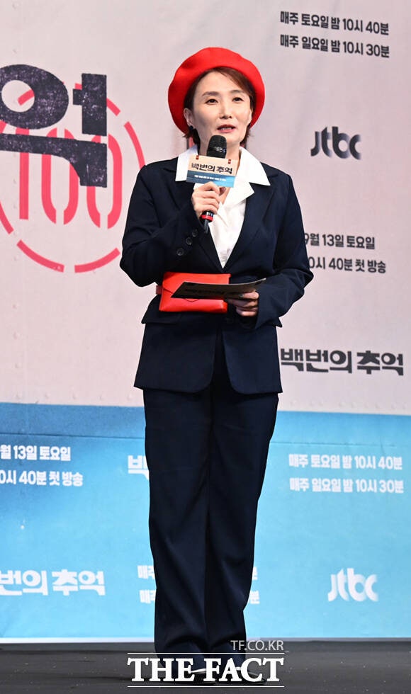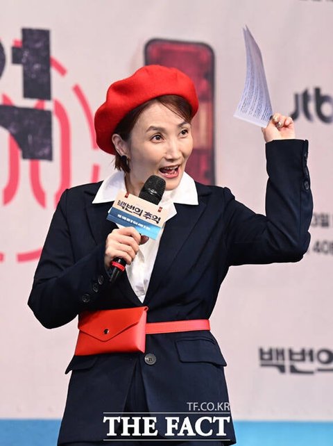 송인 박경림이 11일 서울 구로구 더 링크 서울 호텔에서 열린 JTBC 새 토일드라마 '백번의 추억' 제작발표회에서 극 중 주인공의 직업인 버스 안내양 차림으로 진행을 하고 있다. /이새롬 기자