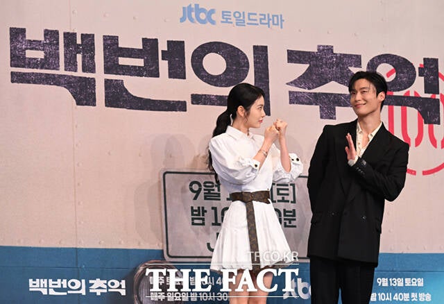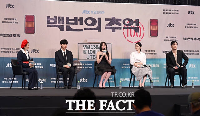 김상호 감독과 배우 신예은, 김다미, 허남준(왼쪽부터)이 11일 서울 구로구 더 링크 서울 호텔에서 열린 JTBC 새 토일드라마 '백번의 추억' 제작발표회에 참석해 포즈를 취하고 있다.