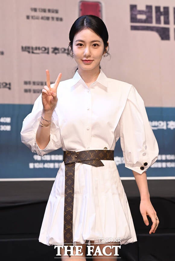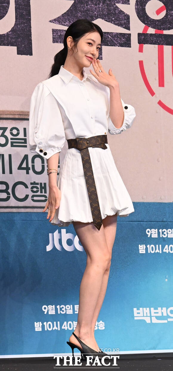 배우 신예은이 11일 서울 구로구 더 링크 서울 호텔에서 열린 JTBC 새 토일드라마 '백번의 추억' 제작발표회에 참석해 포즈를 취하고 있다.