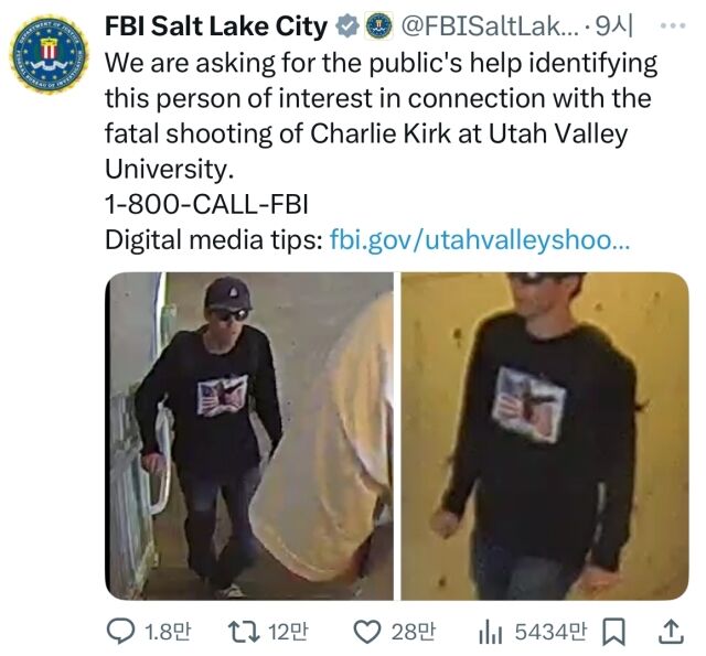 미 연방수사국(FBI) 솔트레이크 지부는 11일(현지시간) 엑스(X·옛 트위터) 계정에 사진 2장을 게시하며, 용의자로 추정되는 인물의 신원 확인에 도움이 될 정보를 요청했다.