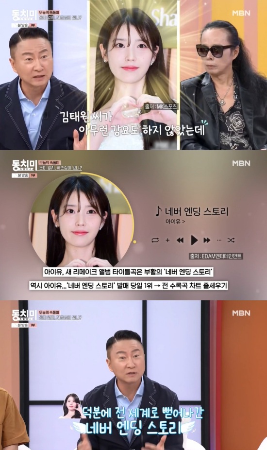 그는 "그걸로도 행복한데, 아이유가 이번에 김태원 씨가 아무런 강요도, 부탁도 하지 않았는데 그냥 'Never Ending Story'를 부른 거다. 그 덕분에 전 세계적으로 (뻗어나가서) 국민 가요가 됐다. 그래서 (김태원의) 저작권료 수입이 갑자기 10위권 안으로 폭등하는 일이 벌어졌다"고 이야기했다.
