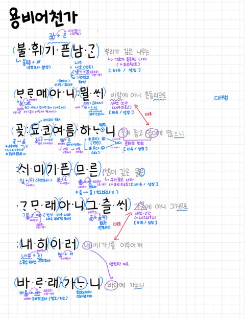+생각 없이 올린 건데 언제부터인가 욕먹고 있길래 추가해요. 제가 몇 시간 동안 저 짓거리하면서 하나하나 정리한 것도 아니고요. 이미 머릿속에 있는 것을 내신용으로 쭉 정리해 본 겁니다. 다 쓰는 데 20분도 안 걸렸어요. 세부적으로 적어 놓은 것들 다 학교에서 선생님들이 집어 주신 것들이고, 그런 부분들 챙기는 게 내신의 기본 아닌가요? 결국 문법 파트 다 맞았고, 기말만 잘 치면 될 것 같아요. 그리고 아직 고1이라 중세 문법 처음 배워서 《용비어천가》 하나만 정리하는 게 아니라 중세 문법 전체를 쭉 정리한다는 마음으로 쓴 거라서 딱히 중요하지 않은 부분도 다 쓰여 있네요. 저희부터 수능 국어가 통합돼서 문법도 무조건 공부해야 해서 그런 것도 있고요