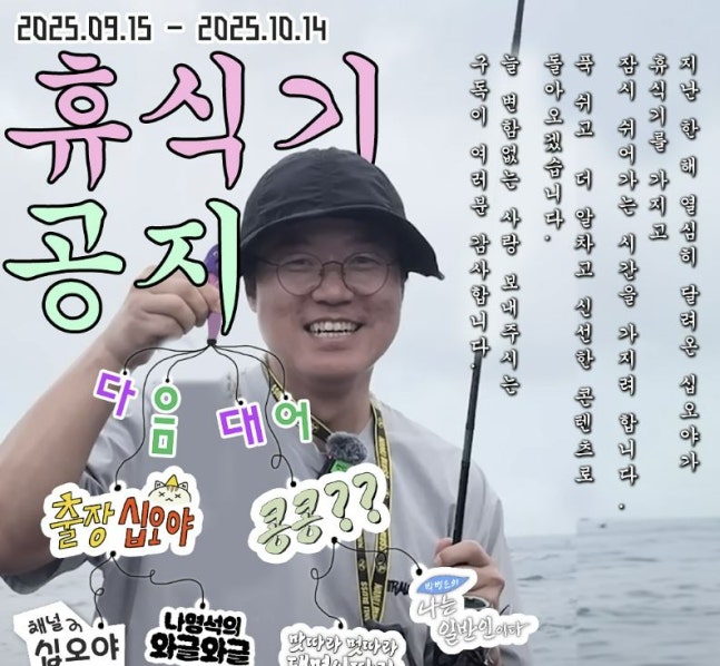 휴식기 기간 : 25.09.15 (월) - 25.10.14 (화). COMING UP NEXT 다음 콘텐츠 대어 : 출장십오야 , 콩콩??, 맛따라 멋따라 대명이따라, 박병은의 나는 일반인이다, 채널십오야 라이부, 와글와글 등등.