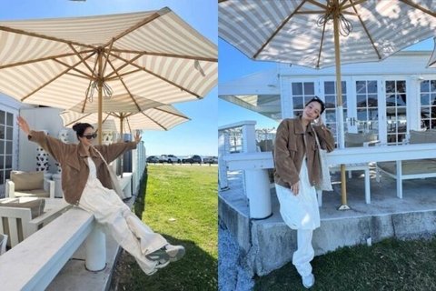머리는 번으로 단정하게 묶고 블랙 선글라스를 얹은 채 환하게 미소 짓는 모습. 강한 한낮의 햇살과 파란 하늘, 잔디와 바다가 어우러진 배경이 청량한 무드를 자아낸다. 이어진 컷에서는 화이트 목조 테라스 앞에서 살짝 고개를 기울인 전신샷으로, 그림자가 만든 줄무늬가 의상의 질감을 한층 살려준다. 또 다른 컷에서는 가로수 옆에서 측면으로 웃는 모습이 포착돼, 넉넉한 실루엣의 재킷과 가벼운 골드 이어링이 더하는 캐주얼한 우아함이 눈길을 끈다.
