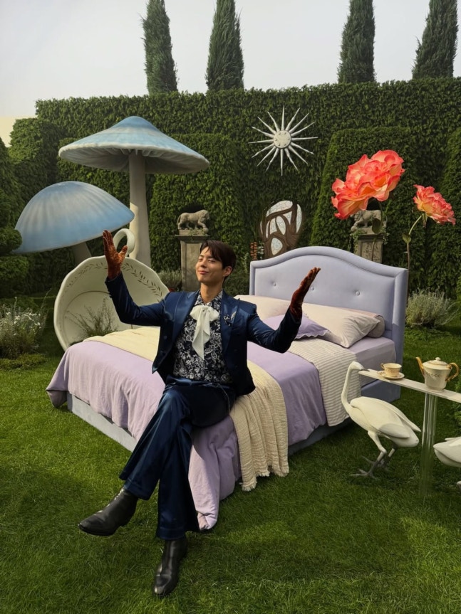 사진 속 박보검은 클래식한 새틴 수트에 화이트 보 타이, 브로치를 더해 왕자님 무드를 만든다. 커다란 토피어리 앞에서는 찻잔을 카메라 앞으로 건네며 초대장을 건넨 듯한 표정을 짓고 버섯 오브제와 침대가 놓인 초현실 정원에서는 양팔을 활짝 펼치며 여유로운 포즈를 취한다.