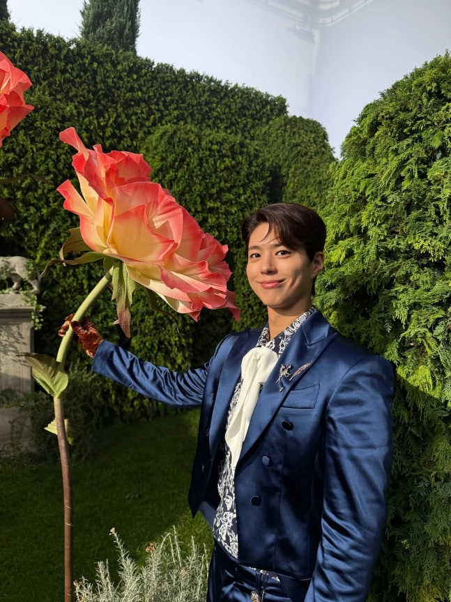 사진 = 박보검 인스타그램박보검은 보랏빛 침대 소품에 기대 눈웃음을 짓는데 매끈한 피부결과 깊은 보조개가 시선을 붙잡는다. 거대한 꽃을 한 손에 잡고 선 디른 컷에서는 동화 속을 산책하는 듯한 청량한 미소가 돋보인다.