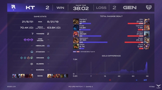 '비디디'의 조이가 벽을 넘어 포킹하던 순간, '듀로'의 블리츠크랭크가 슈퍼 플레이로 조이를 끌어 빠르게 잡았다. 그런데 '덕담'의 직스가 위기를 잘 극복했고, KT가 드래곤 영혼을 챙겼다. KT는 압도적인 포킹의 힘으로 젠지를 무너뜨리고 한타 승리 후 아타칸까지 잡았다.