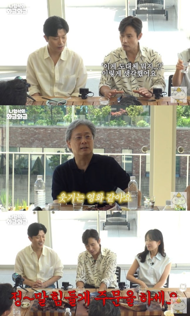나영석 PD는 혼란스러웠던 영화 티저 영상을 언급한 뒤 “제가 볼 땐 박찬욱 감독님의 평소 영화적 전개로 보면 이 중에서 멀쩡하게 살아 나가는 사람이 별로 없을 것 같은 느낌이 강하게 드는데”라고 의심했다. 박찬욱 감독은 “저는 이번에 15세 관람가를 목표로 하고 있다”라며 “제가 만든 영화 중에 제일 웃기는 영화 같다. 이번엔 진입장벽이 아주 낮고 이상한 거 별로 없다”라고 귀띔했다.