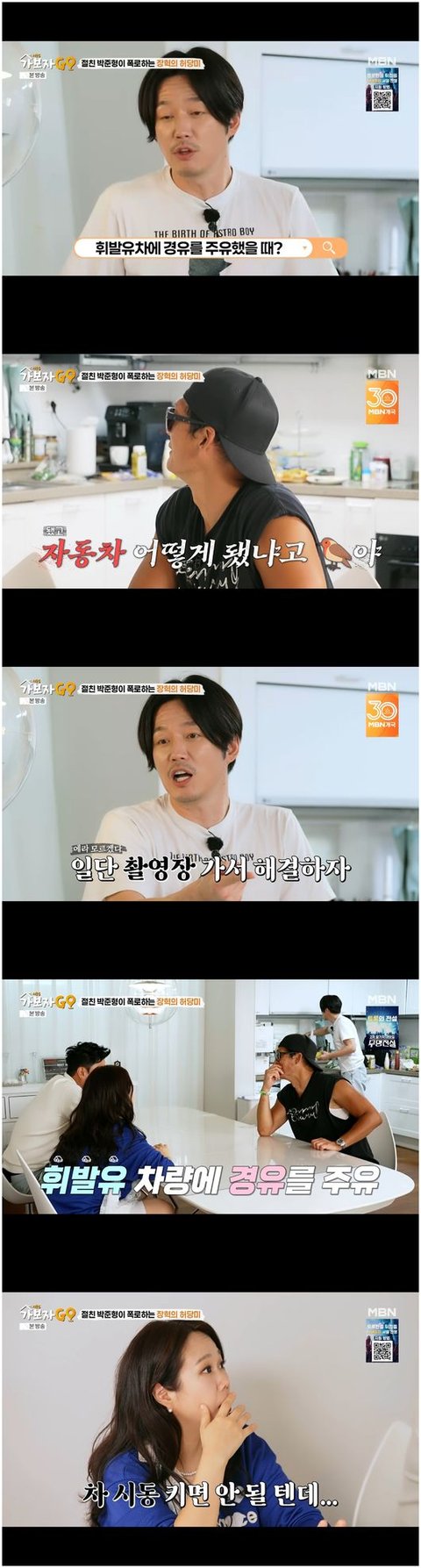박준형은 “자동차 어떻게 됐냐고, 새끼야”라며 바로 물었다. 장혁은 “외국에 오래 있다가 한국에 들어왔는데 경유랑 휘발유가 헷갈렸다. 하필 셀프주유소였다. 그런데 말이 안 된 게, 휘발유랑 경유랑 노즐 사이즈가 다르다. 경유를 주유하고서 깨달았다. 내 차가 휘발유 차라는 걸”이라고 말했다.