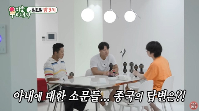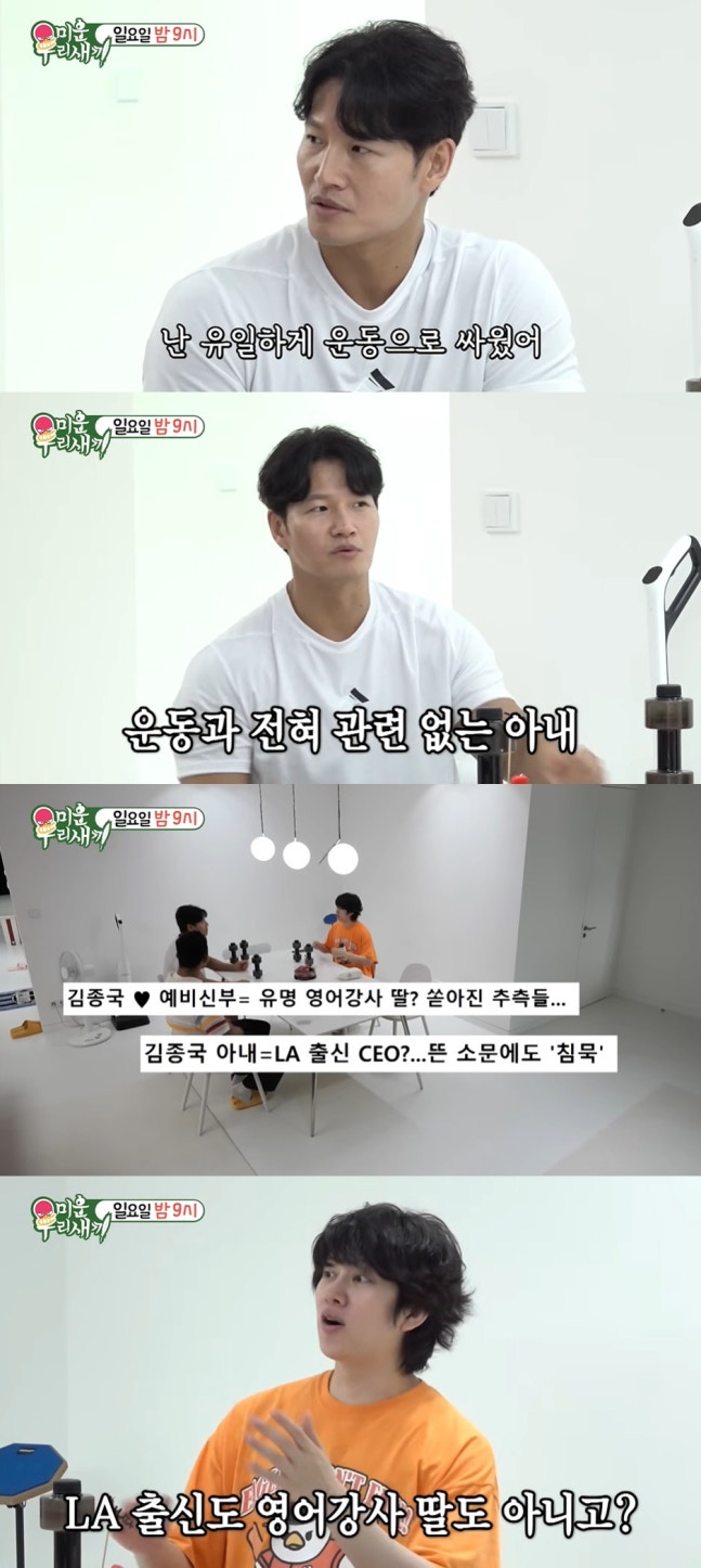 세 아이의 아빠인 김동현은 "살다 보면 다 맞춰진다"면서 "나 같은 경우 운동 좋아하지 않나. 아내는 운동을 안 좋아한다. 근데 운동을 양보할 순 없지 않나. 운동을 해야 되는 이유에 대해서 SNS 볼 때마다 계속 보낸다"면서 운동의 장점을 꾸준히 어필한다고 밝혔다. 이를 들은 김종국은 "너무 좋은 방법이다"면서 "난 유일하게 운동으로 싸웠다"고 털어놨다.그때 김희철은 "헬스장에서 만난 사람이 아니냐"고 묻자, 김종국은 "운동과 전혀 관련이 없다"며 아내에 대해 언급했다. 그러자 김희철은 "이미 소문이 많이 났으니까 'LA 출신 화장품 사업가'라는 소문이 있더라. 화장품 사업가 아니고 LA 출신 영어 강사 딸도 아니냐"면서 김종국의 신부를 향한 다양한 추측 루머에 대해 물었다.