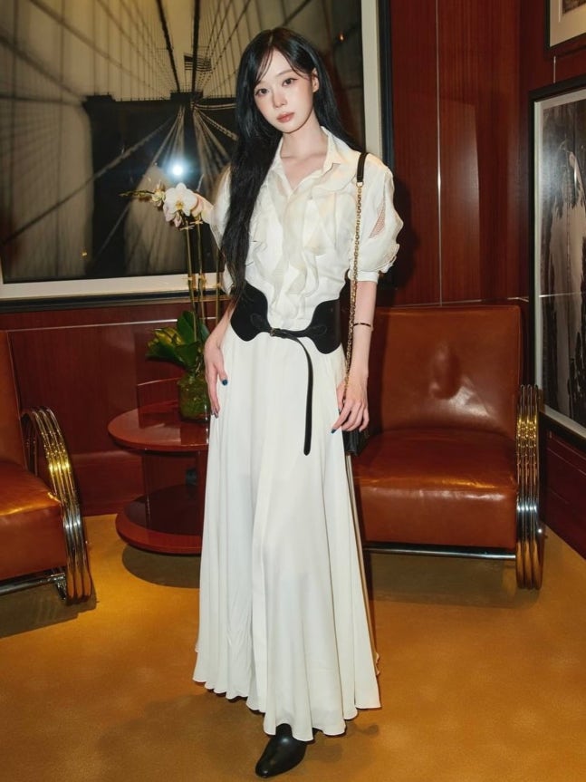 사진에는 차량 뒷좌석에서 아이보리 러플 셔츠 드레스를 입고 카메라를 응시하는 윈터의 클로즈업이 담겼다. 부분 포인트가 들어간 소매와 볼륨 있는 러플, 블랙 와이드 벨트가 허리를 잡아 실루엣을 정리한다.