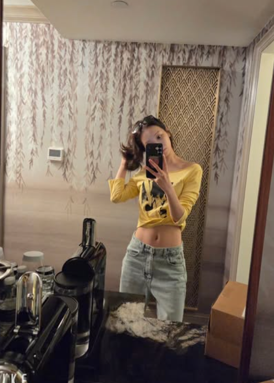 또 다른 사진에서는 거울 앞에서 포즈를 취하는 모습도 담겼다. 티셔츠를 크롭해 배꼽과 복근을 노출, 늘씬한 허리 라인을 강조하기도 했다.
