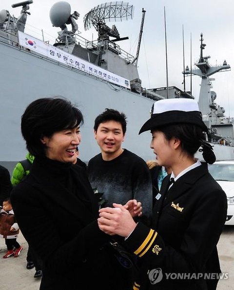 (사진2 설명) 어머니 만난 청해부대 최민정 중위 (부산=연합뉴스) 조정호 기자 = 최태원 SK그룹 회장 딸인 최민정 해군 중위가 청해부대 19진(충무공이순신함)으로 소말리아 아덴만 파병 임무를 무사히 마치고 23일 해군작전사령부 부산기지에서 열린 입항 환영식에 참석, 어머니 노소영 아트센터나비 관장을 만나고 있다. 2015.12.23 ccho@yna.co.kr