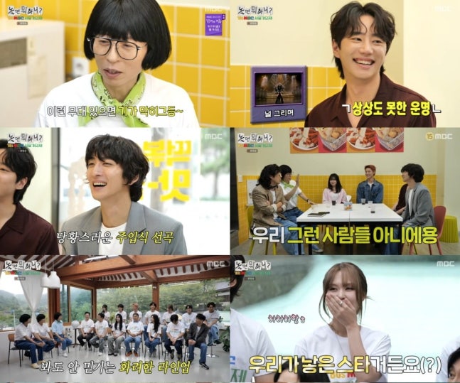 사진=MBC전야제에 다른 스케줄이 있었던 딘딘을 제외한 모든 참가자가 모였다. 유재석은 "유리는 우리가 낳은 스타야. 원래도 스타였지만 힘을 보탰지"라고 자랑스러워하면서, 이이경과의 대기실 일을 물었다. 이이경은 대기실에서 찍은 사진을 보내주겠다고 했고, 최유리는 모기를 잡는 듯한(?) 철벽 리액션으로 이이경을 차단했다. 선곡에 대한 이야기도 이어졌다. 그 와중에 최정훈은 유재석이 강력히 추천한 곡 때문에 고민을 많이 했다면서 선곡 개입 논란을 만들었다. 억울한 유재석은 실제 최정훈이 선곡한 곡을 확인하고 "본인이 하고 싶은 거 했네"라고 오해를 풀어 웃음을 안겼다.