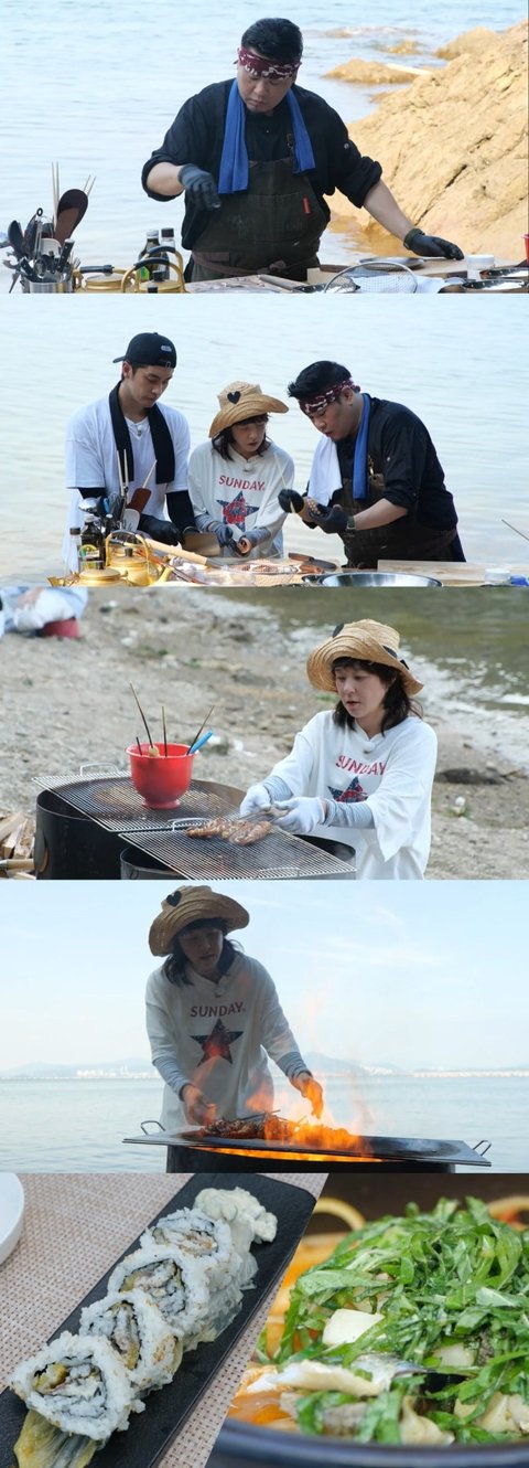'푹 쉬면 다행이야' 최강희가 무인도 레스토랑 손님들을 위해 불 앞에서 무릎을 꿇는다.