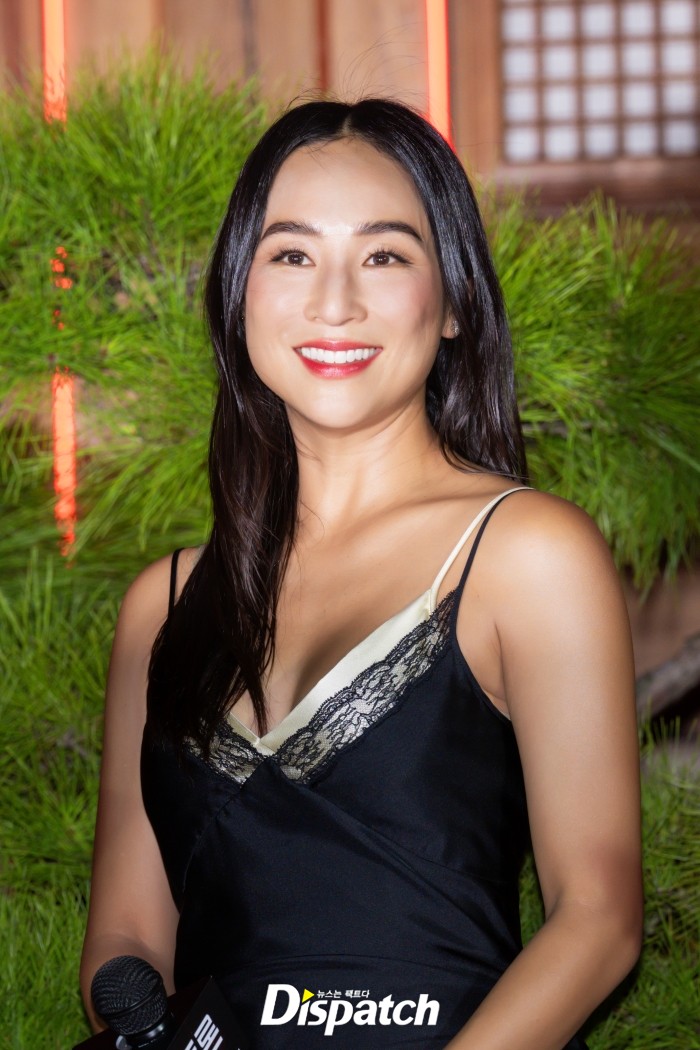 그레타 리는 블랙 슬립 롱드레스로 섹시한 분위기를 연출했다. 볼하트 포즈로 애교를 보이기도 했다.