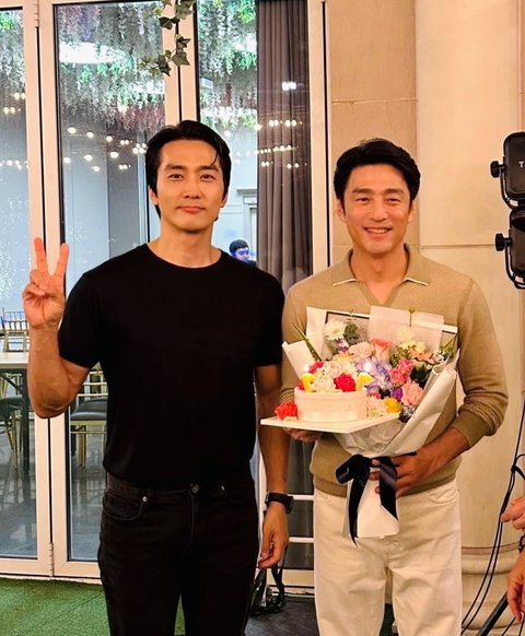 공개된 사진 속 송승헌은 배우 지진희와 함께 환한 미소를 띠고 카메라를 응시하고 있다. 올블랙 패션을 입은 송승헌은 뚜렷한 이목구비와 단정한 분위기로 특유의 카리스마를 발산했고, 옆에 선 지진희는 다양한 표정과 함께 꽃다발을 들고 있어 따뜻하면서도 기품 있는 분위기를 자아냈다.
